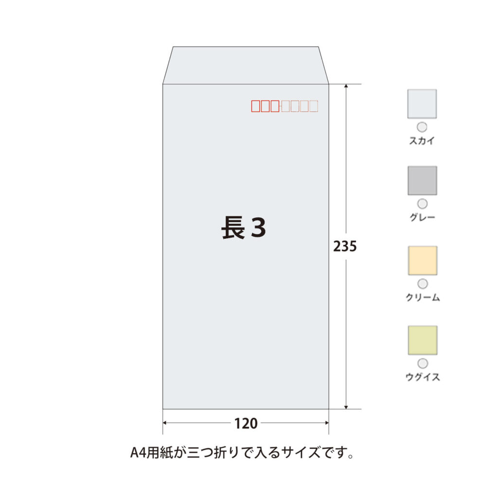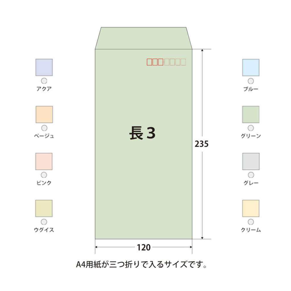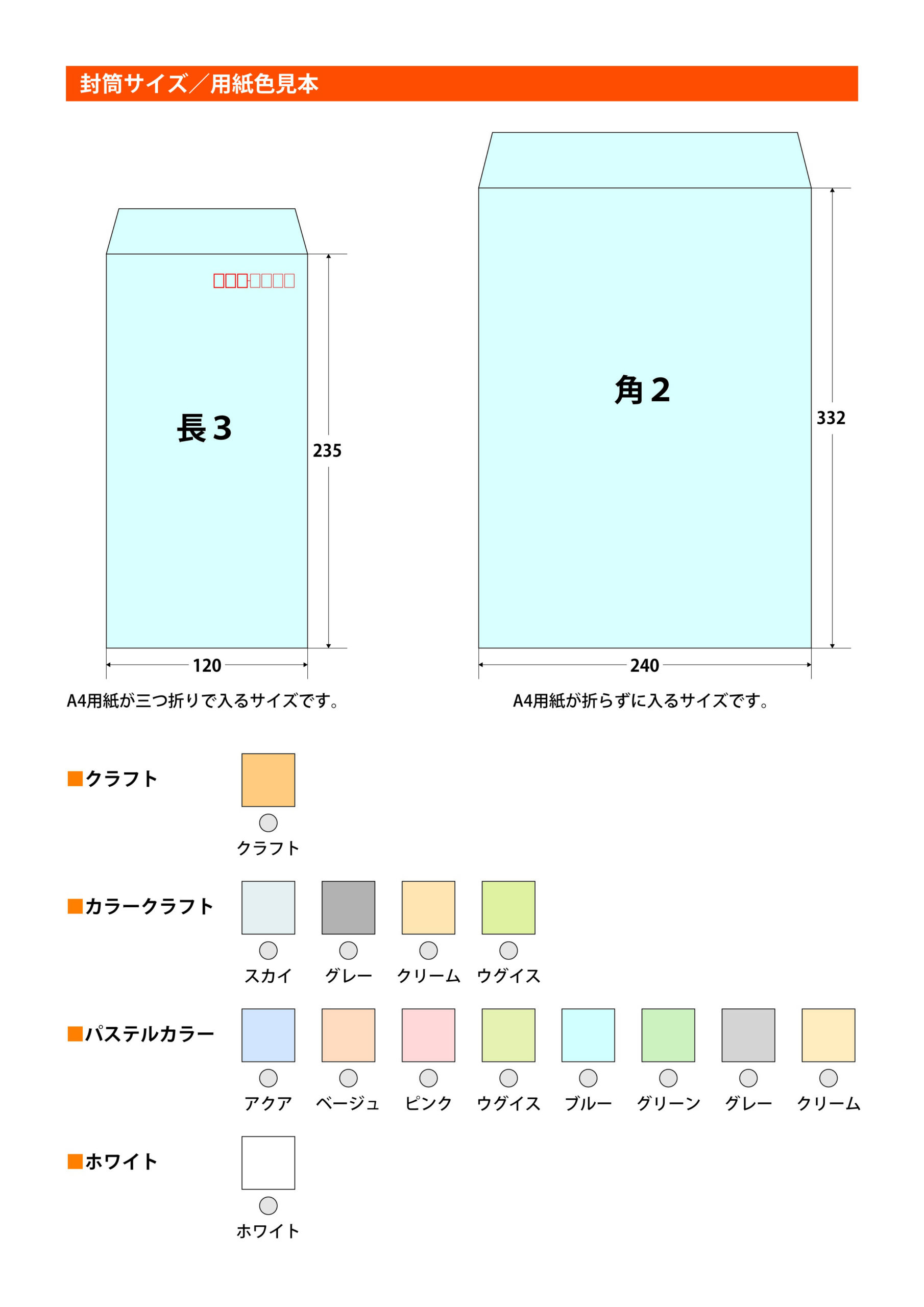 長3封筒 サイズは235mm×120mmです。封筒の色はクラフト、カラークラフト(4色)、パステルカラー(8色)、ホワイトの4種類よりお選びいただけます。社名の書体は明朝、角ゴシック、丸ゴシック、楷書郵便枠付きとなしモノクロ印刷 カラー印刷5営業日での納品となります。 長3封筒 クラフト 長3封筒 カラークラフト 長3封筒 パステル 長3封筒 ホワイト 角2封筒 角2封筒 クラフト 角2封筒 カラークラフト 角2封筒 パステル 角2封筒 ホワイト